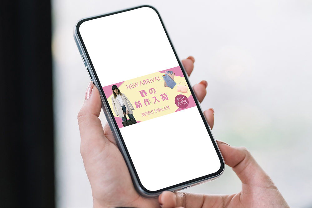 季節感が一目で伝わるよう、春をイメージした配色と写真選定を行い、視認性と訴求力のバランスを意識しています。また、「NEW ARRIVAL」というメッセージが直感的に伝わる構成を心がけました。