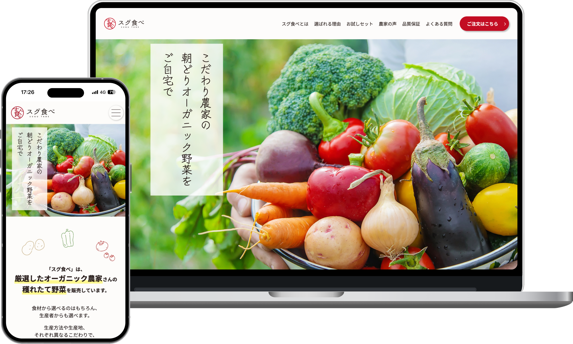 架空のオーガニック野菜宅配サービス「スグ食べ」のランディングページをデジタルハリウッドSTUDIOの課題として制作しました。